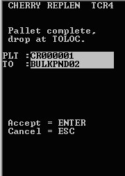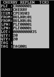- Geben Sie die neue Paletten-ID (LPN) in das Feld PLT ein. Hierbei handelt es sich um das Strichcodeetikett, das zum Packen der Cherry-Picking-Palette verwendet wird. Von der Anwendung wird geprüft, ob für diese ID bereits Cherry-Picking-Ergänzungen vorhanden sind. Ist dies nicht der Fall, werden die Ergänzungsaufgaben erstellt. Auf dem RF-Gerät werden Ergänzungen auf der Grundlage der Routenreihenfolge für den Ausgangslagerplatz (Von Lagerplatz) angezeigt.