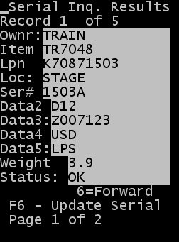 El operador de RF que trabaja en el almacén tiene la oportunidad de consultar información específica de stock para los números de serie. Esta información se puede presentar en forma de una vista de lista en la que aparecen varios registros o bien en una única vista de pantalla en la que se muestra más información acerca de uno de los registros.