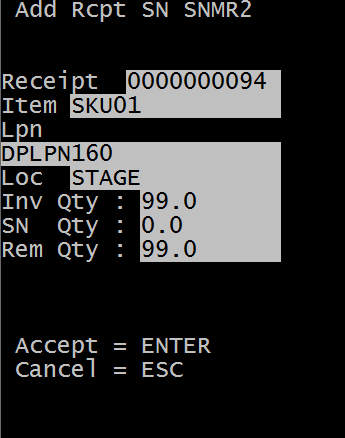En el menú Mantenimiento de números de serie (SNM), seleccione Añadir NS a recepción. Se muestra la pantalla Aña NS recep (SNMR1).
