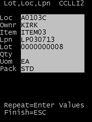 Desde el menú Inventario rotativo, seleccione Lote, Ubicación, LPN. Aparece la pantalla Lote, Ubicación, LPN (CCLLI1C).