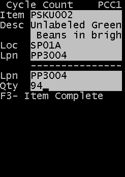 Las tareas se emitirán por orden de ID de ubicación de línea rápida y de número de artículo. Cuando el operador finalice un recuento, el mismo artículo volverá a mostrarse para someterse al recuento otra vez. Esto permite que el operador registre más de una ID de palet para el artículo en la ubicación. Una vez que hayan finalizado todos los recuentos del artículo, el operador pulsa la tecla F3 para indicar al sistema de que puede proceder con la siguiente tarea.