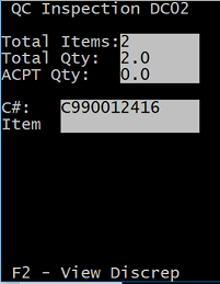 - Si se ha validado el contenido del contenedor pero el sistema indica que hay al menos un artículo con discrepancia, no se muestra la pantalla Inspecciones de CC DC02A. Puede pulsar F2 para ver las discrepancias. Al pulsar F2, aparece la pantalla Visualización de discrepancias QCOVR. En esta pantalla solo se muestran los artículos del contenedor que no están completados. Pulse F3 para registrar un error para el artículo que se muestra.