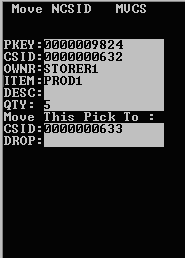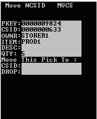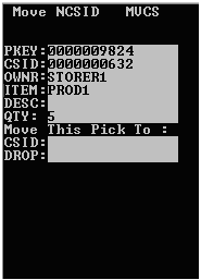 Seleccione Trasladar contenido caja de almacenaje. Se muestra la pantalla Trasladar NSCID (MVCS).