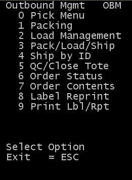 En el dispositivo de RF, seleccione Principal > Menú de salida. Se muestra la pantalla Administración de salida (OBM).
