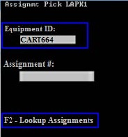 Si ha seleccionado Preparación de asignaciones, se muestra la pantalla Preparar asign. LAPK1. Para recibir la tarea de preparación, introduzca el id. de equipamiento y el número de asignación. Tenga en cuenta que si el tipo de equipamiento se incluye en la asignación, el campo ID. equipo es obligatorio. Si no, puede pulsar Intro para desplazarse a otros campos.