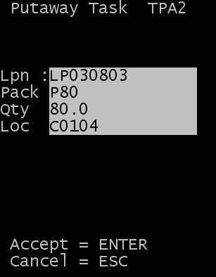 Esta pantalla se puede modificar fácilmente para acoger el número de palets que un operador puede almacenar. Por ejemplo, si se va a trasladar un máximo de dos palets, edite la pantalla TPA1 para que los campos Lpn3, Lpn4 y Lpn5 no estén visibles. De esta manera, se limitan los campos que se muestran y se reduce el número de teclas requeridas para iniciar el proceso de almacenamiento. Para obtener más información sobre la modificación de pantallas de RF, consulte la Guía del administrador.