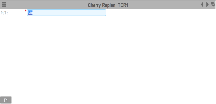 - Especifique el nuevo id. de palet (LPN) en el campo PLT. Se trata de la etiqueta de código de barras utilizada para crear el palet de "cherry pick". La aplicación comprueba si existen preparaciones de tipo "cherry pick" para este id. Si no las hay, la aplicación crea las tareas de reabastecimiento. El dispositivo de RF muestra los reabastecimientos basándose en la secuencia de ruta de la Ubicación de origen.