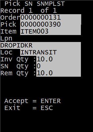 Si nécessaire, appuyez sur F6 pour afficher la liste des numéros de série qui ont déjà été associés à la palette. L'écran SNRESULT affiche la liste des numéros de série contenus dans la palette actuelle.