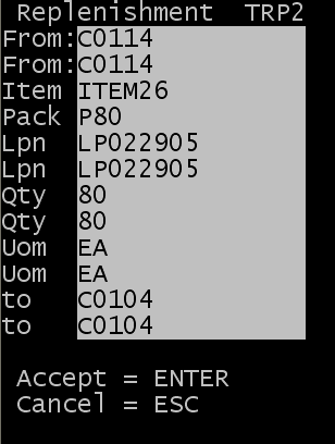 Cette rubrique ne décrit pas en détail les différents champs et étapes requis pour un réapprovisionnement complet ou un prélèvement dynamique. Pour plus d'informations sur le réapprovisionnement, reportez-vous au manuel Infor WMS Réapprovisionnement - Guide de l'utilisateur.
