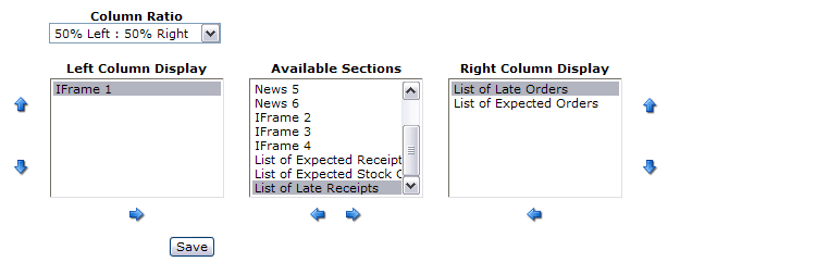 - Les sections Affichage colonne gauche et Affichage colonne droite gèrent les informations affichées sur la page d'accueil. Pour déplacer un élément du groupe Sections disponibles vers la section d'affichage gauche ou droite, cliquez sur la flèche gauche