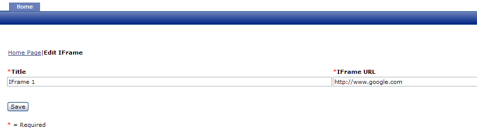 Entrez le Titre à utiliser comme description IFrame dans la barre de titre. Dans le champ URL IFrame, entrez l'URL Web à afficher sur la page d'accueil. Appuyez sur Enregistrer pour fermer l'écran et mettre à jour la page d'accueil avec le nouveau contenu.