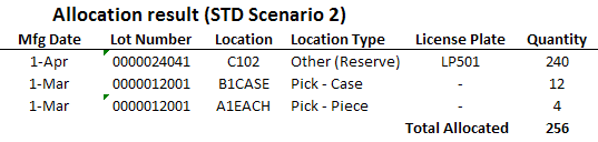 Surallocation = désactivé / Réessayer si quantité restante = désactivé / Prendre en compte le stock d'emplacement de prélèvement actuel = OFF