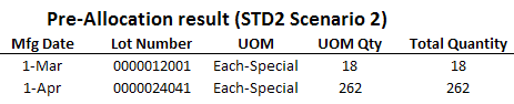 Cet exemple diffère du scénario 1 car la ligne de détail de la stratégie d'allocation utilisée a été modifiée pour pouvoir utiliser l'option Sélectionner emplacement par Paramètre sur Vider l'emplacement (Quantité la plus élevée).