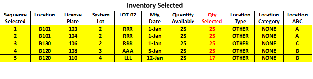 - Enregistrements valides ensuite triés par quantité basse à élevée, lot 04, emplacement ABC, puis emplacement.