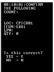 - Si la quantité figurant dans l'emplacement ne correspond pas à celle du champ QTE du terminal RF, sélectionnez N (Non). Une demande de comptage sera alors générée. Continuez le prélèvement.