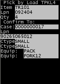 Pour confirmer le numéro de palette sur lequel vous effectuez le prélèvement, appuyez sur Entrée. L'écran Prél par chg. (TPKL4) suivant s'affiche pour vous permettre d'indiquer le type de contenant et l'emplacement.