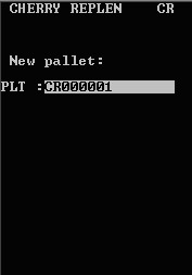 - Entrez le numéro de la nouvelle palette dans le champ PLT. Il s'agit de l'étiquette à code-barres utilisée pour créer la palette de réapprovisionnement CherryPick. L'application vérifie qu'il existe des réapprovisionnements CherryPick correspondant à cet ID. S'il n'en existe pas, l'application crée les tâches de réapprovisionnement. Le terminal RF affiche tous les réapprovisionnements en fonction de l'adresse logique De emplacement.