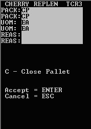Remarque- Si l’ensemble du réapprovisionnement CherryPick est abandonné, vous disposez de l’option Fermer palette qui permet d’affecter le statut Annulé à toutes les tâches. Pour sélectionner la fonction Fermer palette, appuyez sur F.