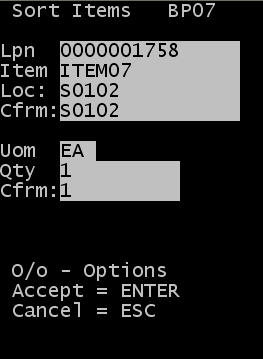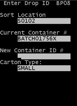 新しいコンテナ番号の作成 仕分処理中に新しいコンテナ番号を作成するには、[BP07] 画面で [O/o] オプションを使用し、次の手順を実行します。 このオプションが [品目仕分] 画面に表示されているときに、[O] キーまたは [o] キー (ゼロではありません) を押します。 [新しいコンテナ番号] フィールドに新しいコンテナ ID を入力します。 [Enter] キーを押します。 この処理によって、新しい出庫コンテナが作成されます。作成されたコンテナは、この注文の現在の仕分タスクとその後の仕分タスクの両方で利用できます。注文用に必要な数のコンテナを作成できます。