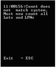 品目とロケーションのレベルで棚卸を実行して、棚卸数量がアプリケーションでの数量と一致しない場合、以下のようなエラーメッセージが画面に表示されます。この場合は、ロット/ロケーション/LPN レベルで棚卸します。
