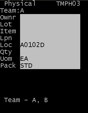 - [N] (いいえ) を選択します。次の画面が表示されます。この画面では、ロケーションにタスクのなかった在庫を入力できます (画面 TMPH03)。