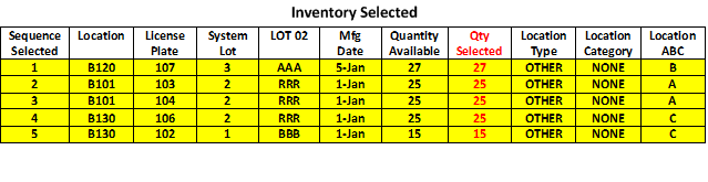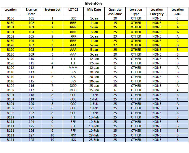 - 考慮されなかった在庫は青色で表示されます。以下のロットは、許容範囲日数の範囲外 (在庫の最も古い日付コードから 30 日以上) にあるため対象外です。