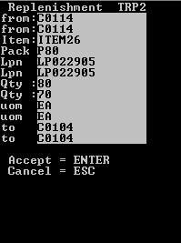 最初の補充タスクを取得するには、[Enter] キーを 2 回押します。[補充 (TRP)] 画面に、[エリア 1] フィールドに指定したロケーションまたはエリアの補充がすべて表示されます。これらのタスクは、受け取った順番通りに実行する必要があります。