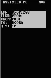 手順 4: 出庫用パレットの移動 ピックアンドドロップロケーションから [出庫注文] 画面で指定されているドックドアに移動する追跡 ID を取得します。 現在のピックアンドドロップロケーションにある情報を [追跡 ID] フィールドに指定します。通常、この手順は別の RF ユーザーが行います。[補助移動 (MVA)] 画面が表示されます。 追跡 ID に登録されている商品を、指定されているドア、または顧客レーンに移動します。 移動タスクを処理するには、[Enter] キーを 2 回押します。 画面を終了するには [Esc] キーを押します。