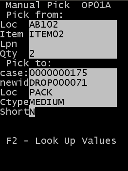 現在のケース ID およびロケーションの品目について、予想よりも少ない数量をピッキングする場合にのみ、このフィールドを [Y] に更新します。これにより、注文でピッキングされる数量が更新されます。