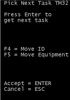 - 移動の後に、ピッキングプロセスを継続するために、作業者には [次のピックタスク (TM32)] 画面が表示されます。