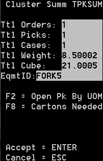 ピックするウェーブ番号をスキャン、または指定してから、[Enter] キーを押します。[クラスタサマリー画面 (TPKSUM)] 画面が表示されます。