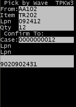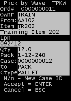 [Enter] キーを押してタスクを確定すると、[ウェーブ別ピッキング (TPKW2)] 画面が表示されます。[Esc] キーを押して、タスクをキャンセルできます。この際には、タスクを実行しなかった理由を示すために、理由コードを使用する必要があります。
