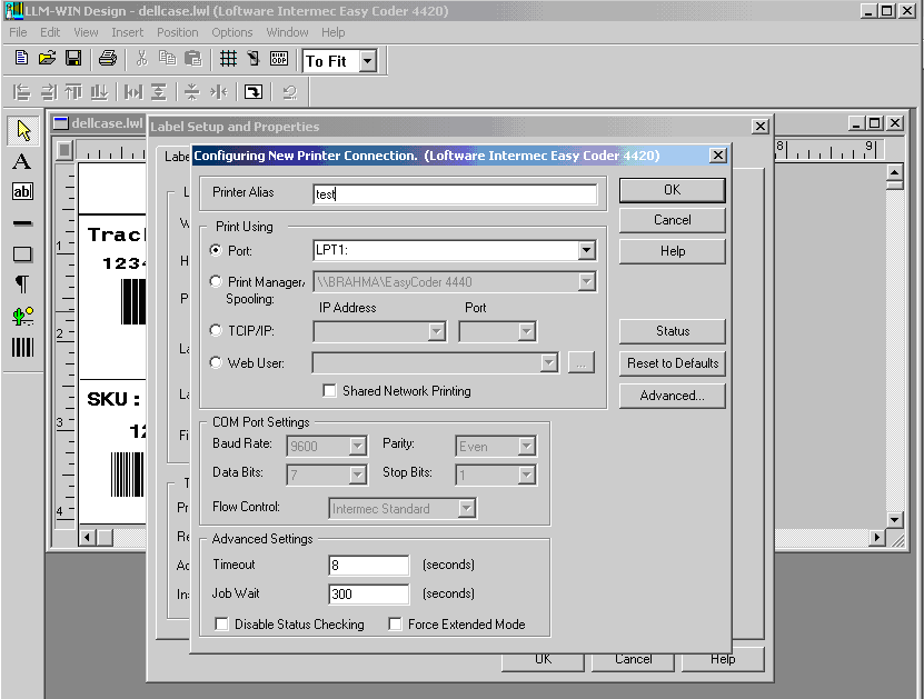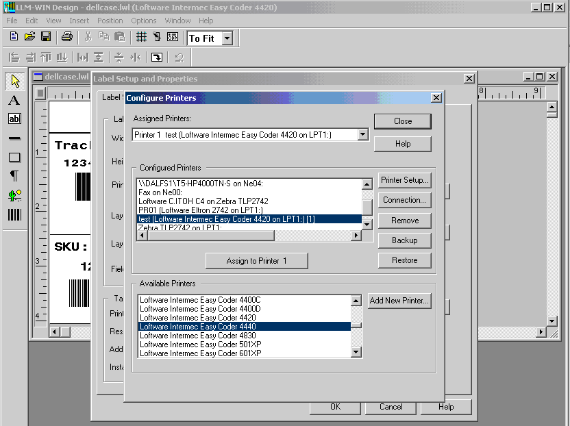 - 設定済のプリンタリストの下で、設定済のプリンタを選択します。この例では、[test [Loftware Intermec Easy Coder 4440 on LPT1:][1]] を選択します。