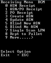 RF 端末での仕入先コンプライアンス質問への回答 ASN に仕入先コンプライアンス質問が含まれているという通知を受け取った場合は、RF 端末で質問に回答できます。 仕入先コンプライアンス質問に回答するには: ログイン (WMS L1 画面)、該当する倉庫の選択、機器 ID の選択 (機器チェックがオンになっている場合) が完了したら、[WMS メインメニュー (M2)] 画面から [0 入庫] を選択します。 [プリンタ選択 (RC)] 画面が表示されます。 [Enter] キーを押します。[入庫メニュー (RCM)] 画面が表示されます。 [9 詳細] > [8 仕入先質問] を選択します。 [ASN の入力 VCQ1] 画面が表示されます。 回答の必要な質問を含む ASN を指定し、[Enter] キーを押します。[仕入先質問 VCQ2] 画面が表示されます。 ASN がわからない場合は、[F2] キーを押して ASN ルックアップを実行できます。 [回答] フィールドに回答を指定します。 [F3] キーまたは [Enter] キーを押して、システムに対する応答を更新します。次の質問がある場合は、その質問を含む [仕入先質問 VCQ2] 画面が再表示されます。 回答を指定し、[F3] キーまたは [Enter] キーを押してシステムを更新し、残りの各質問に回答します。