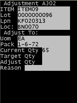 按“Enter”键。系统会显示“调整 (AJ02)”屏幕,其中包含系统库存当前数量的其他信息。
