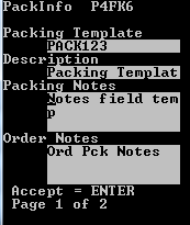 按 Tab 键切换到“货品”字段,指定适用的货品信息,然后按“F6”(显示 PackTemp)。“PackInfo (P4FK6)”屏幕会显示下列包装模板信息。