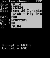 若要获得第一个补货任务,请按“Enter”键两次。系统会显示“补货 (TRP)”屏幕,其中显示了存在于“区域 1”字段中所指定的区域或区中的所有补货。必须按指定顺序执行这些任务。