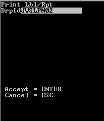 使用其他 RF 拣货屏幕打印 若要为“射频辅助式”、“射频控制”、“任务管理”、“动态拣货”和“分配拣货”屏幕的落放 ID 打印地址标签和内容报告,请进行下列操作: 启用“PRINTADDRLBLORREPORT”系统标志打印地址标签、内容报告,或这两者。 完成拣货过程后,“RF” 屏幕会显示按 “Enter” 键获得下一项任务或者按 “F6” 键打印地址标签/内容报告信息。 按“F6”键并提供落放 ID 以打印标签和报告。