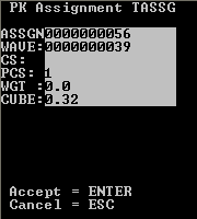 可以按“F2”查找分配号。“分配列表 (CRESLT)”屏幕显示未结工作分配。导航到适用的分配并按“Enter”键进行选择。系统会再次显示“分配拣货 (LAPK1)”屏幕。