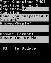 When you log on to equipment or change from one equipment item to another piece of equipment, you may be presented with equipment checks questions. If the equipment check selection within the system settings is turned on and there is an equipment checks strategy tied to the equipment ID, you must respond to the displayed equipment checks questions.