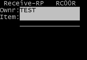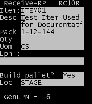 - Select Rcpt to Pallet. The Receive-RP RCC01R screen is displayed. This screen has been configured to activate the elements required to create a rainbow pallet for putaway.