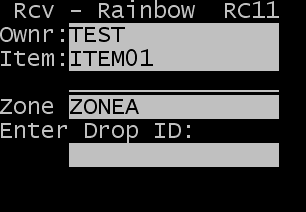 - Enter one of the items that you are receiving to get to the second screen (RC10R). Use F7 to Complete the ID. Screen RCC01E is displayed. On this screen, scan or input the Drop ID (parent) assigned during the receipt.
