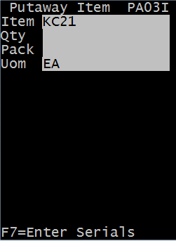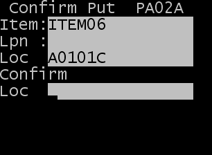 If license plates are not being used for product that has been received, you must input the item number to initiate the putaway. To complete RF-assisted putaway for a single ID:
