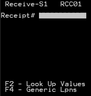 - Screen RCC02 then displays to allow you to input the LPN or specific Case ID to receive. This screen displays because the Receipt has been defined as Case Level or SSCC. Scan or input one of the following and press Enter.