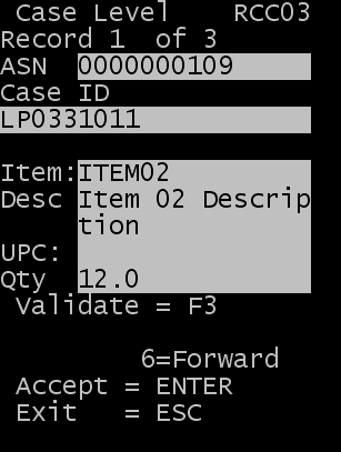 Note: If the LPN contains multiple cases, press F6 (forward) or F4 (back) to scroll the list of items associated with the LPN.