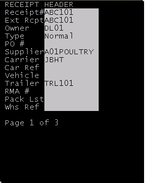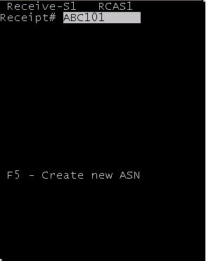 You can create a new receipt on the RF device. The receipt is saved to the ASN/Receipt table when you press Enter on the last Header screen.