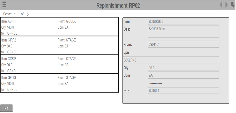 - The Replenishment (RP02) screen is displayed with the tasks to be performed. You can either accept the first task, or select a different task by pressing 6 (forward) or 4 (back).