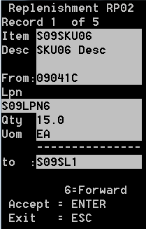 - To accept a task, press Enter. Each time you accept a task, the Replenishment (RP03) screen is displayed.