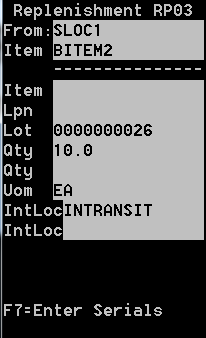 Location verification sample The confirmation fields on the Replenishment (RP03) are the Item, Qty, and To Location.