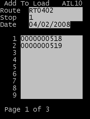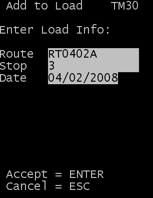 - The Add to Load (TM30) screen is displayed. Specify the route, stop, and date information; then click Enter.